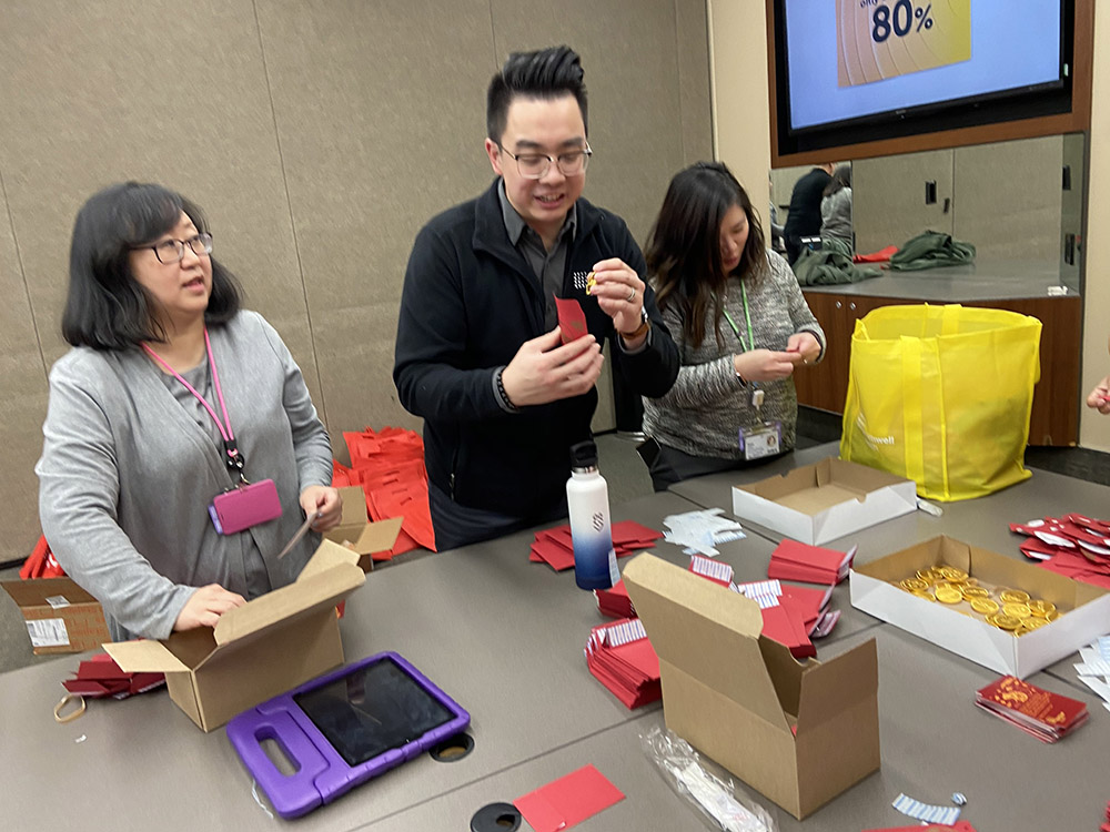 We also hosted a packing event, to prepare giveaways to be distributed during the parade in Flushing. Team members assisted by helping to pack bags and red envelopes filled with a special chocolate gold coin. Red envelopes are usually gifts presented at social and family gatherings such as weddings or holidays. The red color of the envelope symbolizes good luck and is a symbol to ward off evil spirits. The envelopes are usually given to children by the elder of the household.