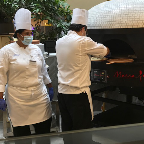 Kevin Dinh, an alumnus of the Culinary Institute of America, is the chef de partie of the pizza kitchen and helps ensure everything runs smoothly and correctly. Kevin uses his past experience working within pizzerias to prepare the fresh dough and works with the tournant chefs who prepare the sauces and vegetables. Together they’re helping to lead the way in healthcare culinary arts