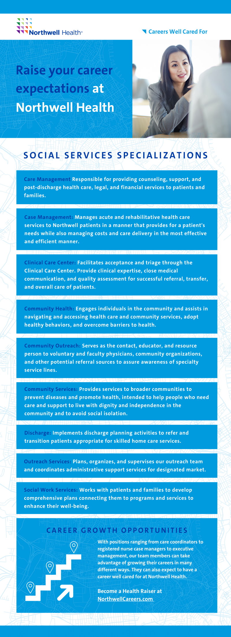 Careers in Social Services at Northwell Health provide opportunities to learn, grow and raise your career expectations in a field where you can truly impact the community. Whether your career journey is just starting out, moving into a more senior position, or you’ve begun to explore a new direction, Northwell has the resources to support and guide you on your path. Below, you will find information on the many areas of specialization for the social services profession at Northwell. For the complete job profiles of each role, we invite you to visit NorthwellCareers.com or click on the link below to discover a career well cared for with our team.