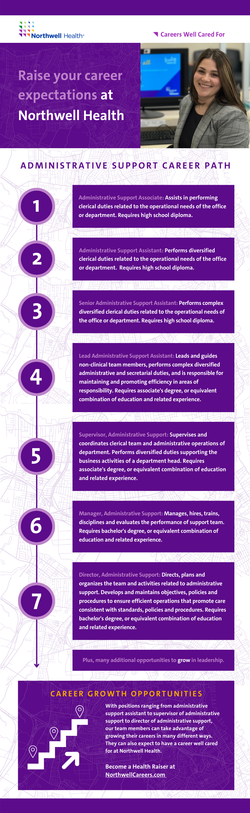 Below, you will find information on one of the many career path opportunities, administrative support assistant to director of administrative support at Northwell. For the complete job profiles of each role, we invite you to visit NorthwellCareers.com, or click on the link below to discover a career well cared for with our team. There are many ways to grow in an administrative support position outside of this path as well, from project management to operations and more.