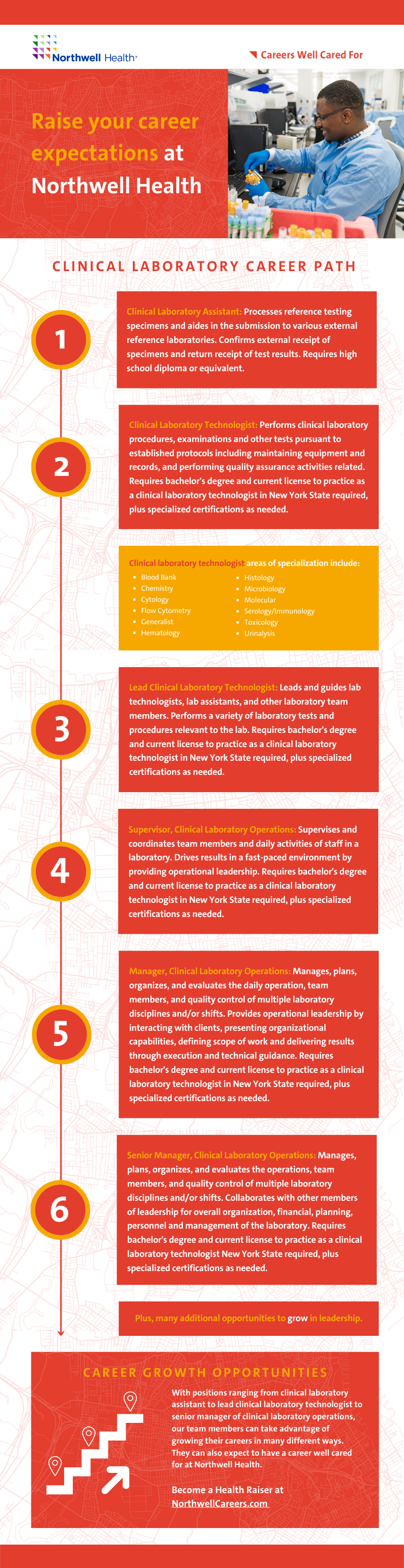 Below, you will find information on one of the many career paths for a laboratory technologist. For the complete job profile of each role, we invite you to visit NorthwellCareers.com, or click on the link below to discover a career well cared for with our team. There are many ways to grow in a clinical laboratory position outside of this path as well, from quality to education and more.