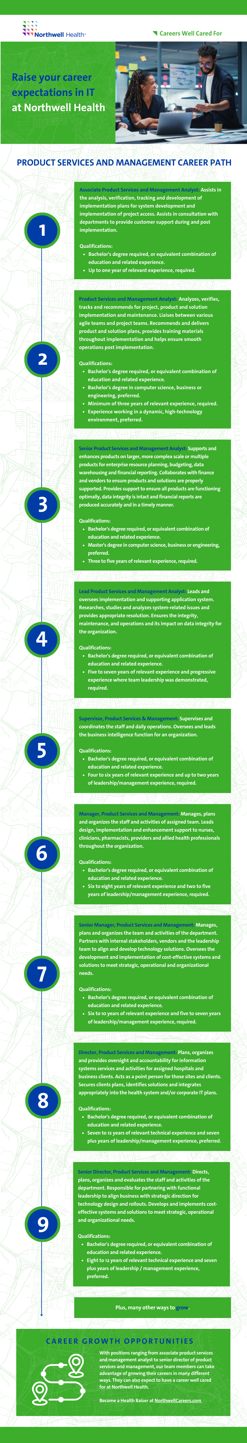 Whether you are just starting out in your IT career or want to take the next step in your journey with a more senior-level position, Northwell offers resources designed to support you no matter what path you are on. Below, you will find career growth opportunities in product services and management. For the complete job profiles of each role, we invite you to visit NorthwellCareers.com or click on the link below to discover a career well cared for in IT at Northwell.