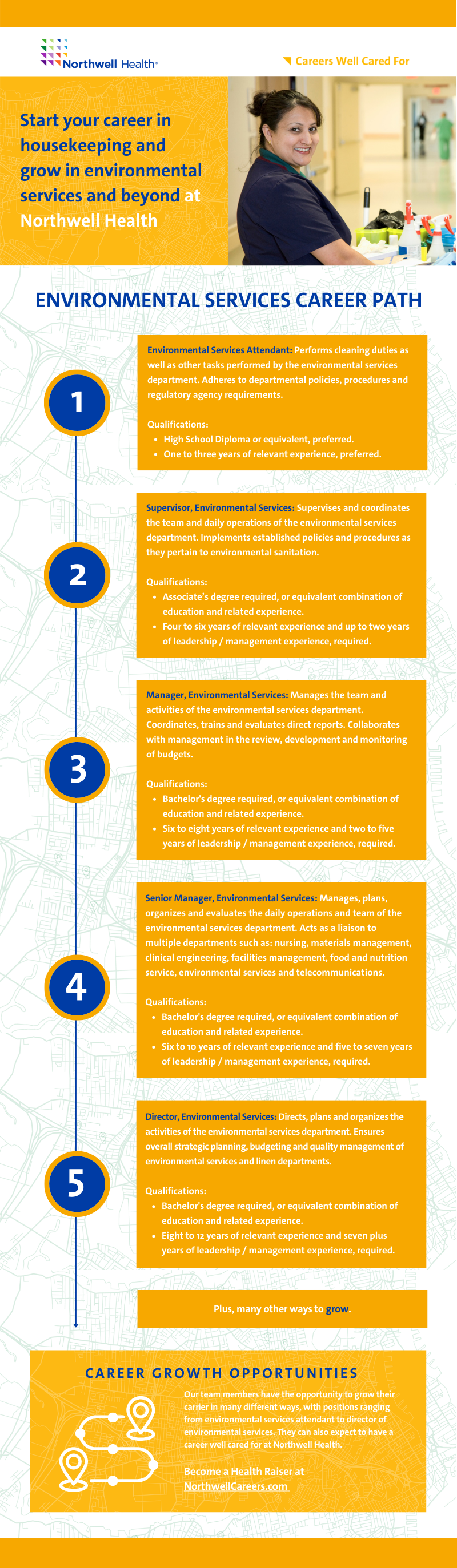 Below, you can learn more about one of the many ways you can grow in your environmental services career; from housekeeping to a director of environmental services. For the complete job profiles of each role, we invite you to visit NorthwellCareers.com or click on the link below to discover a career well cared for at Northwell.