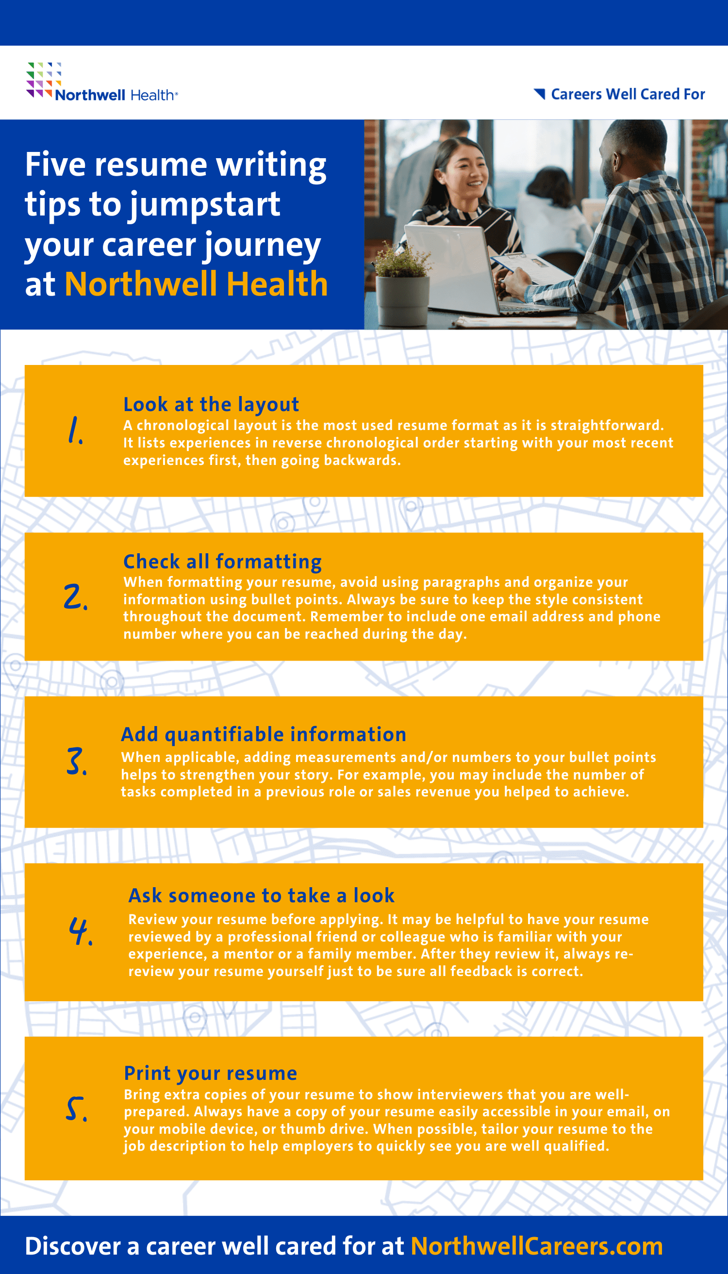 Are you ready to jump into a new career at Northwell Health? We’ve compiled our top five resume tips to help you succeed in your next job interview, plus download our extensive resume writing guide. Discover a career well cared for with us today at NorthwellCareers.com.