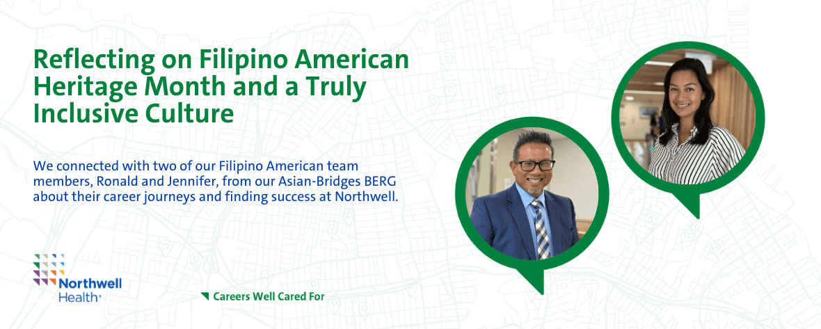 With this year’s Filipino American Heritage Month theme, “A History of Struggle, Solidarity, and Resilience,” we wanted to connect with two of our Filipino-American team members, Ronald and Jennifer, from our Asian-Bridges BERG (Business Employee Resource Group) about their career journeys and finding success at Northwell.