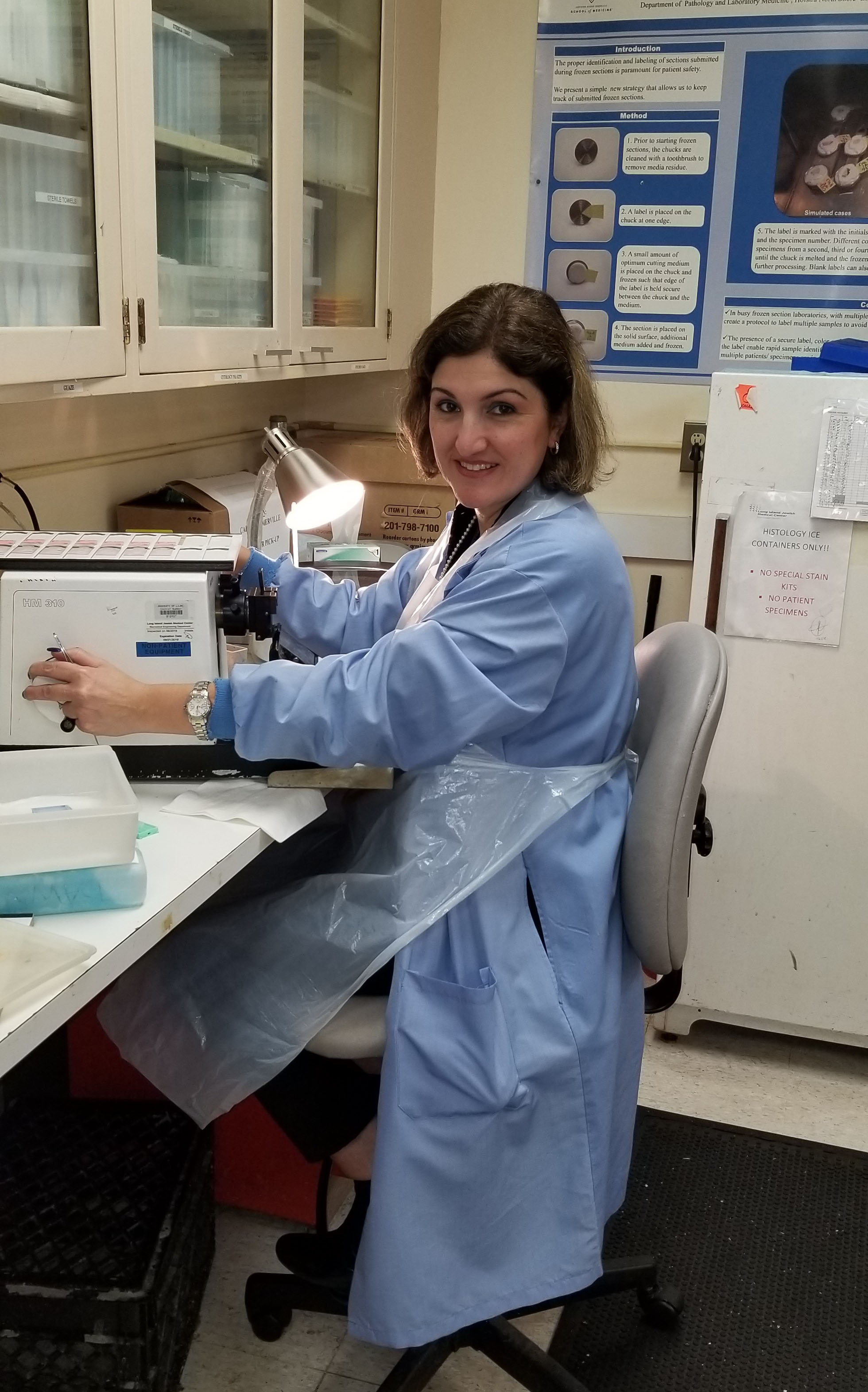 Yana M. cutting ribbons of tissue on microtome (microtomy).