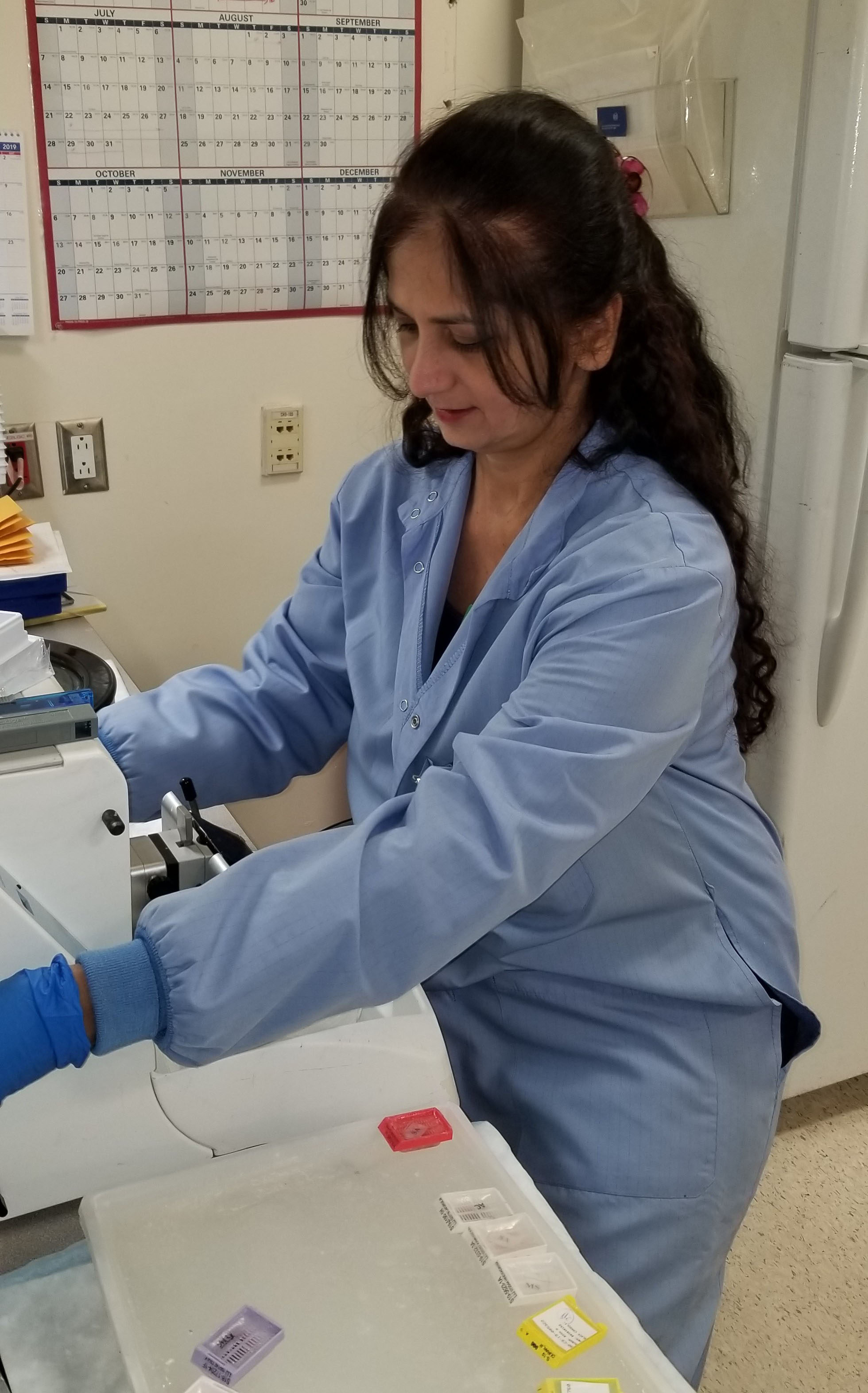 Aparna G. cutting ribbons of tissue on microtome (microtomy).