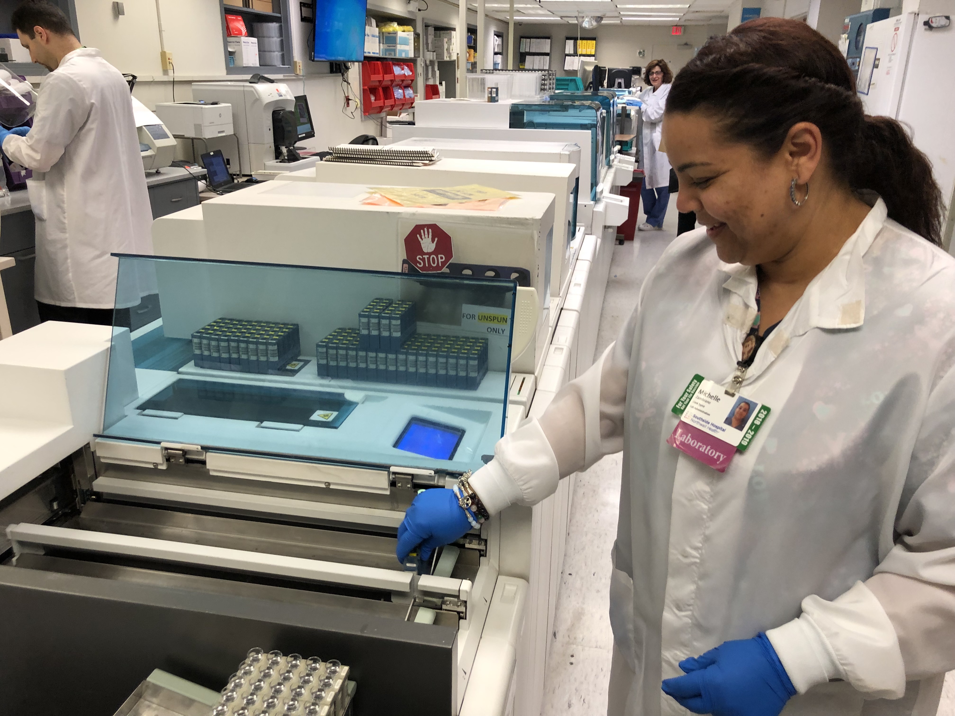 Before any testing can occur, the specimen needs to be collected. Northwell’s phlebotomists meet with patients to draw their blood at the beginning of their care. “It’s the first step for everything medical,” says Bulah Martin, lead phlebotomist who has worked at Northwell for more than 10 years. Once the blood has been drawn, phlebotomists like Bulah let it clot before placing it in the centrifuge, scanning it in the system, and preparing it for transport. From there it’ll head to Core Lab for routine testing like abnormal cell screens and white blood cell counts.
