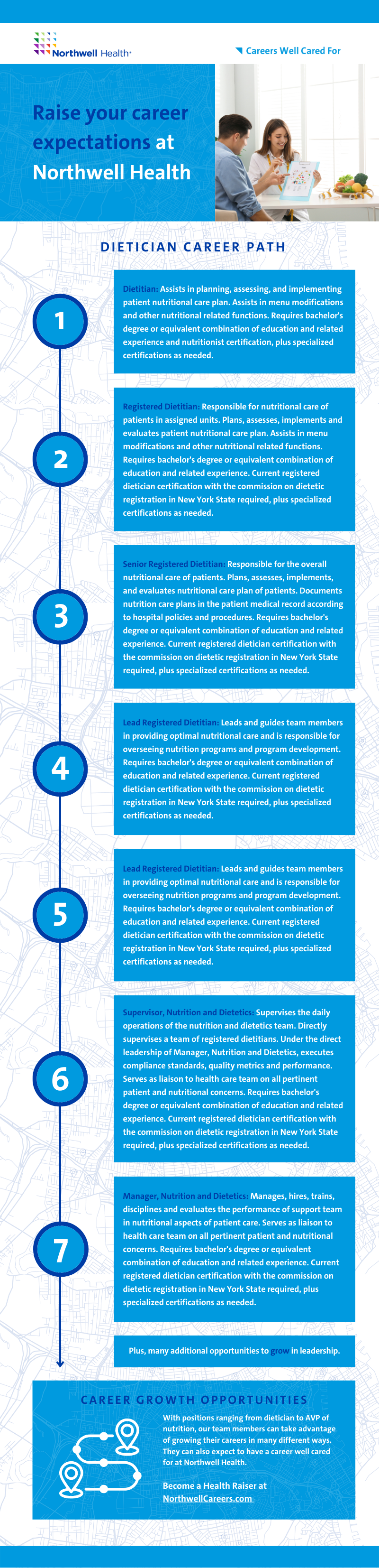 Below, you will find information about one of the many career paths for a registered dietician. Whether your career journey is just starting out or you’ve begun to explore a new direction, Northwell has the resources to support and guide you on your journey. Visit NorthwellCareers.com for the complete job profile or click the link below to discover a career well cared for.