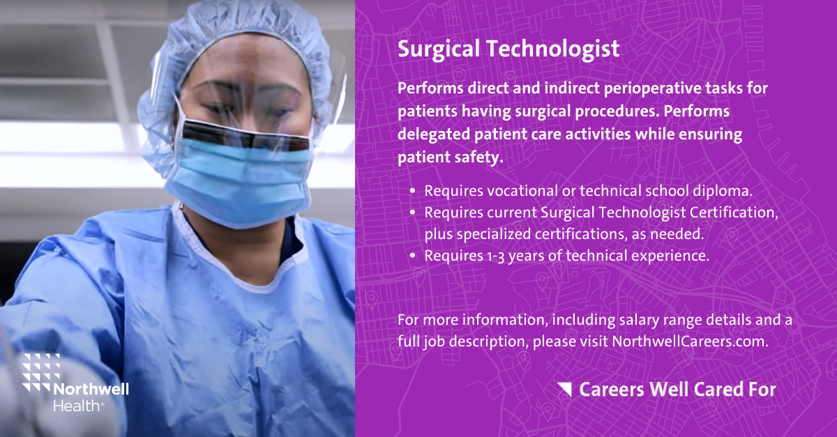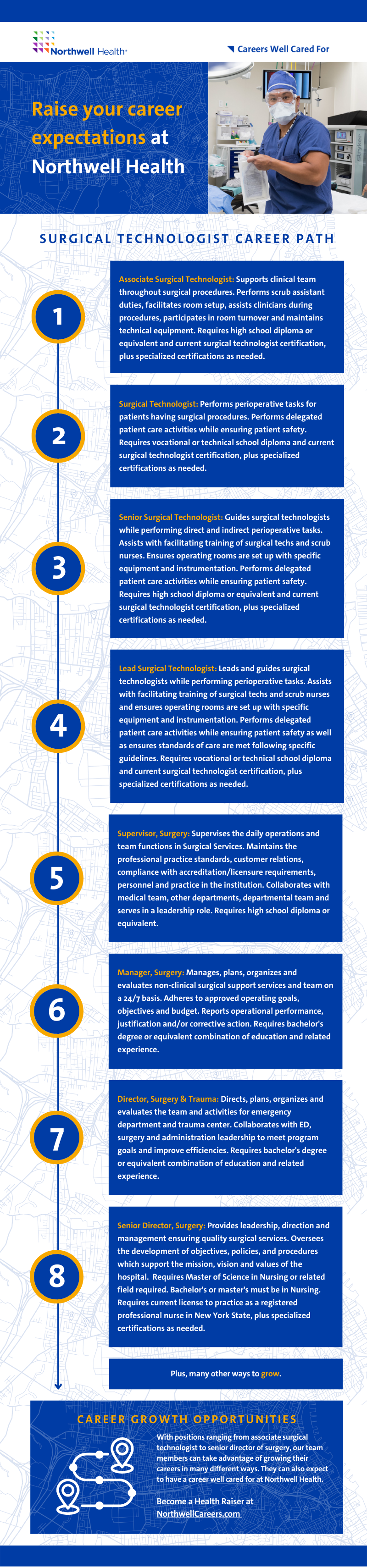 Below, you will find information about one of the many career paths for a surgical technologist. Whether your career journey is just starting out or you’ve begun to explore a new direction, Northwell has the resources to support and guide you along the way.