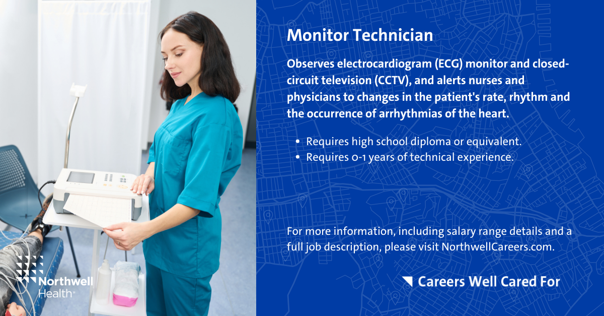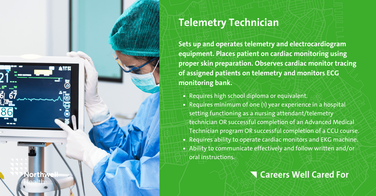 Telemetry technicians observe various monitors and alert nurses and physicians to changes in the patient’s rate, rhythm and the occurrence of arrhythmias.