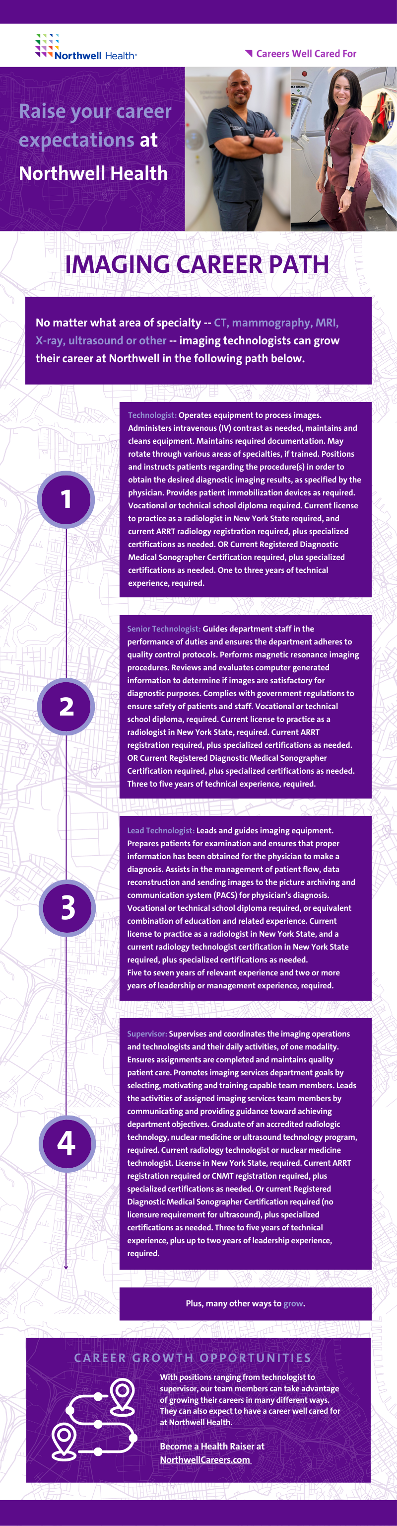 Below, you will find just a few career growth opportunities for CT, mammography, MRI, X-ray, ultrasound or other areas of specialty. For the complete job profiles of each role, we invite you to visit NorthwellCareers.com or click on the link below to discover a career well cared for with our imaging team.