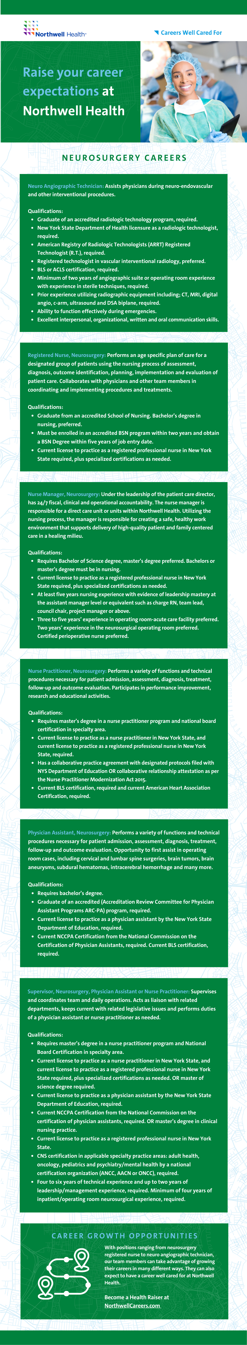Want to work in a profession that uses innovative technology to diagnose and treat patients during their most critical times? Explore exciting opportunities across neurosurgery — from nurse manager to physician assistant, and more. At Northwell Health, our team members have access to professional development opportunities, including programs at our Center for Learning and Innovation (CLI), mentorship programs, tuition reimbursement and more.