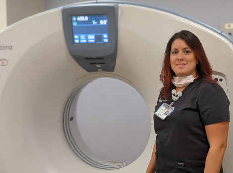 As a CT technologist, Carmen operates a computed tomography machine to create detailed images of internal organs, bones, soft tissue, and blood vessels. She helps prepare patients for various exams and ensures that the radiologist has all of the clear information needed to make an informed diagnosis. Her responsibilities also include managing the patient flow and assisting the x-ray department, when needed.