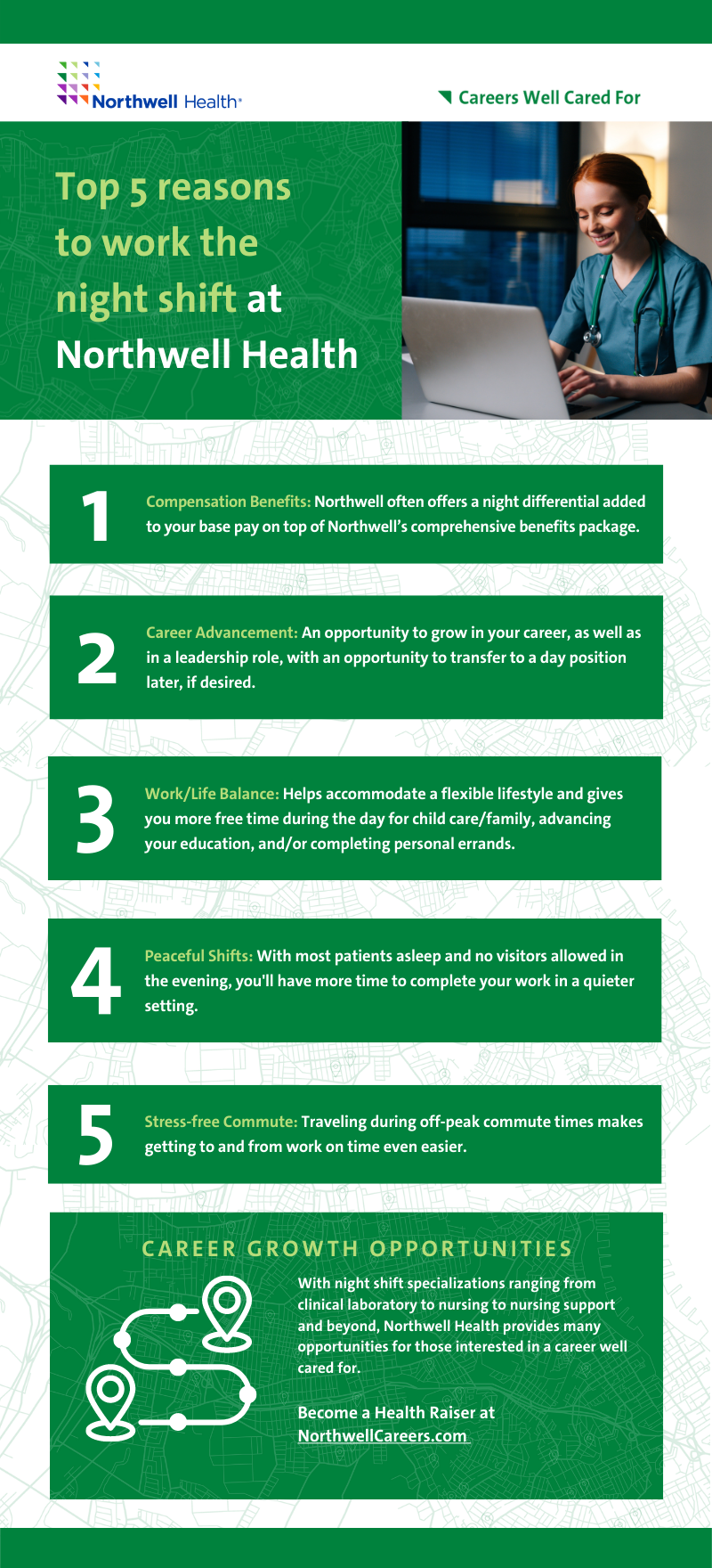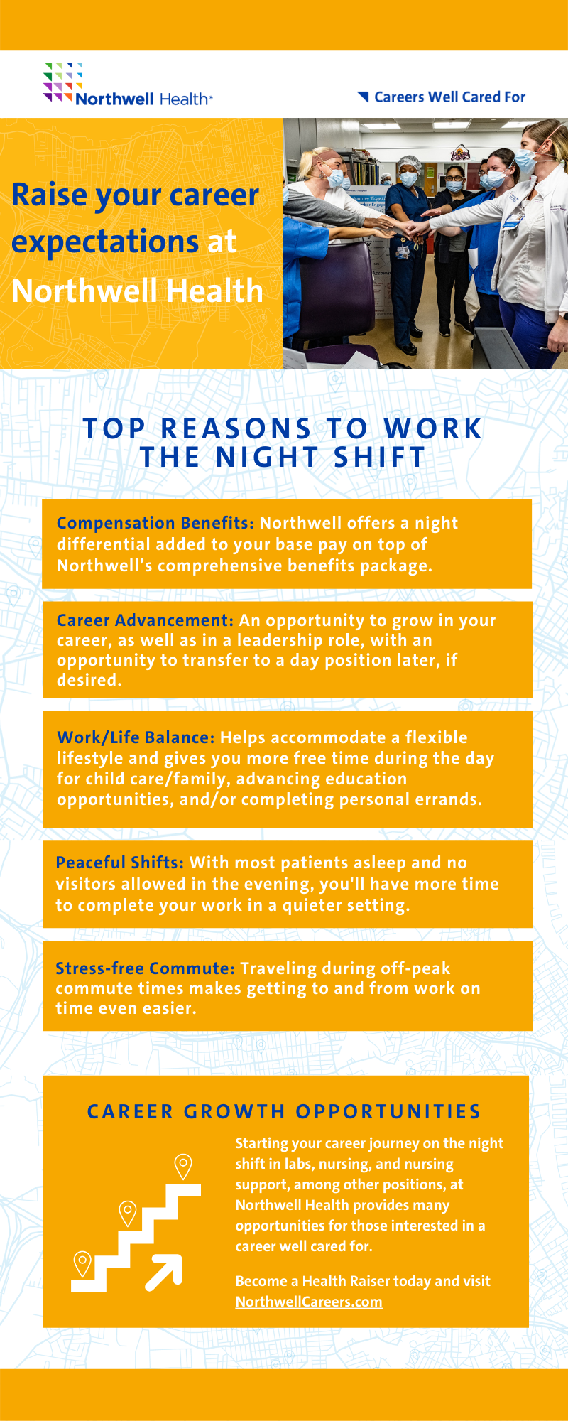 At Northwell Health, working night shifts has several benefits from having the flexibility in your schedule for child care and family to pay differential. As a Fortune 100 Best Companies to Work For®, Northwell provides many night shift opportunities in nursing, nursing support, respiratory therapists, clinical labs, ACPs and more. Learn more about our top reasons below, and begin your journey to a career well cared for at Northwell Health.