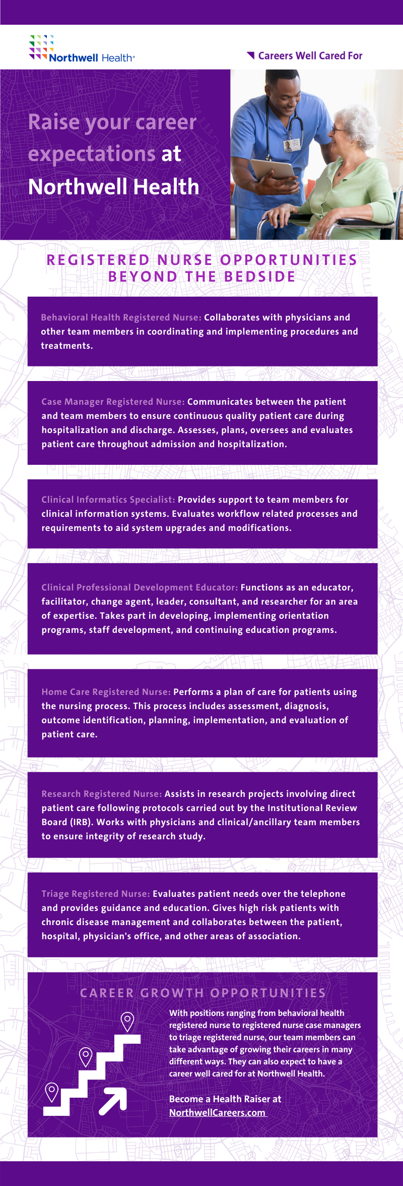 Nursing careers at Northwell Health goes beyond the bedside—there are many different ways for nurses to make an impact for patients and their families. As a Fortune 100 Best Companies to Work For®, Northwell offers competitive benefits, education and career growth opportunities for registered nurses, no matter what area of nursing interests you. See below for several nursing positions beyond the bedside to jump start your exploration for a career well cared for.
