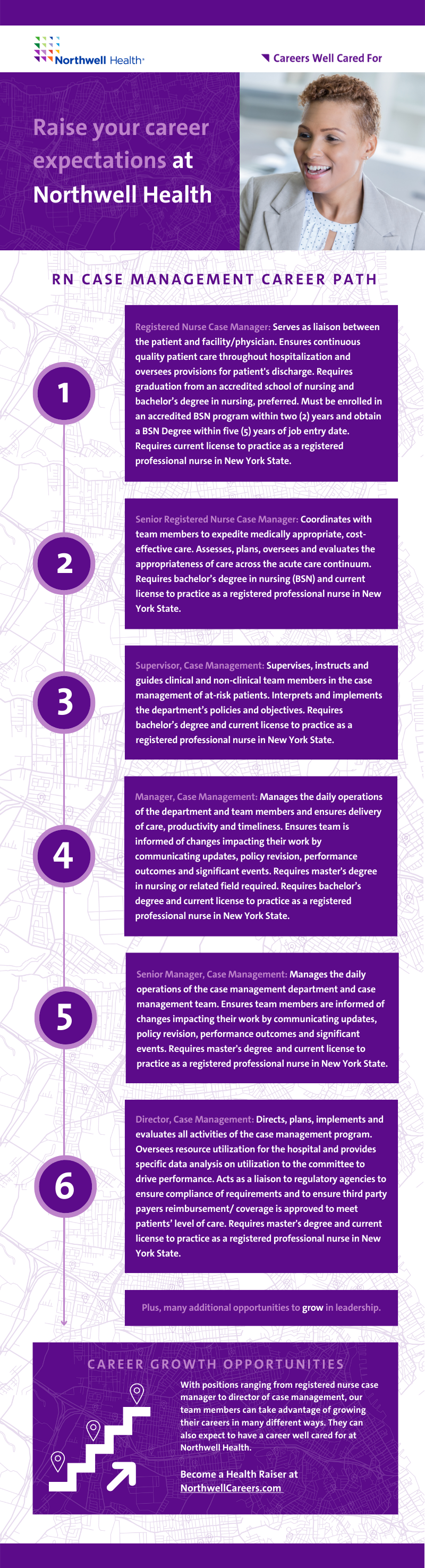 Northwell has the resources to support and guide you in your career journey. Below, you will find information about the many career paths for a registered nurse case manager. For the complete job profile, we invite you to visit NorthwellCareers.com, or click the link below to discover a career well cared for with our team.