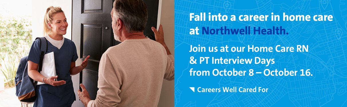 Northwell is looking to hire home care registered nurses (RNs) and physical therapists (PTs) across the New York area. Join us for our upcoming Home Care RN and PT Interview Days at our job fairs in Long Island, Manhattan and Queens this October. At these events, you will have an opportunity to speak with our recruiters about Home Care RN and PT roles, learn more about our company culture and benefits, receive resume tips, career growth and resume guidance and more!