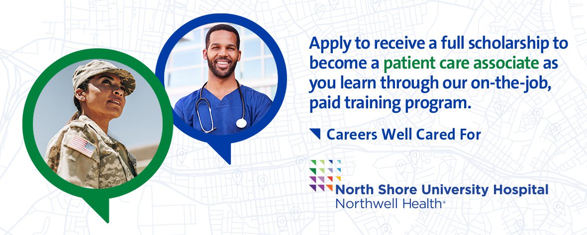 Northwell Health is providing a full scholarship to all veterans and military service members who participate in the North Shore University Hospital Patient Care Associate Train and Earn Program. Please submit your resume in advance.