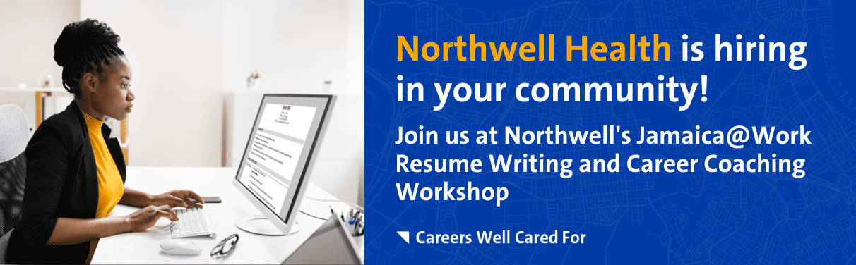 Raise your career expectations with a career well cared for at Northwell Health. We invite you to attend Northwell’s Jamaica@Work Resume Writing and Career Coaching Workshop. Connect with our recruiters* and explore job opportunities available at Northwell Health from administration to nursing, and hospitality to social work — plus more.