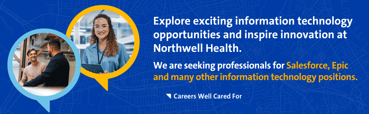 Northwell Health is seeking Health Raisers for Salesforce, Epic and many other information technology positions. Our IT team members are some of the most forward-thinking in healthcare, earning us a Most Wired designation multiple years in a row. We are on an exciting digital transformation journey—developing and deploying innovative solutions designed to personalize the patient experience and meet the needs of our patients, clinicians, team members and community.